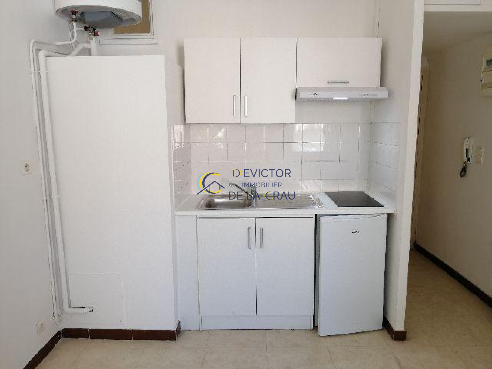 avec coin-cuisine aménagé et équipé (plaque, hotte, frigo), une salle de bains avec wc.
